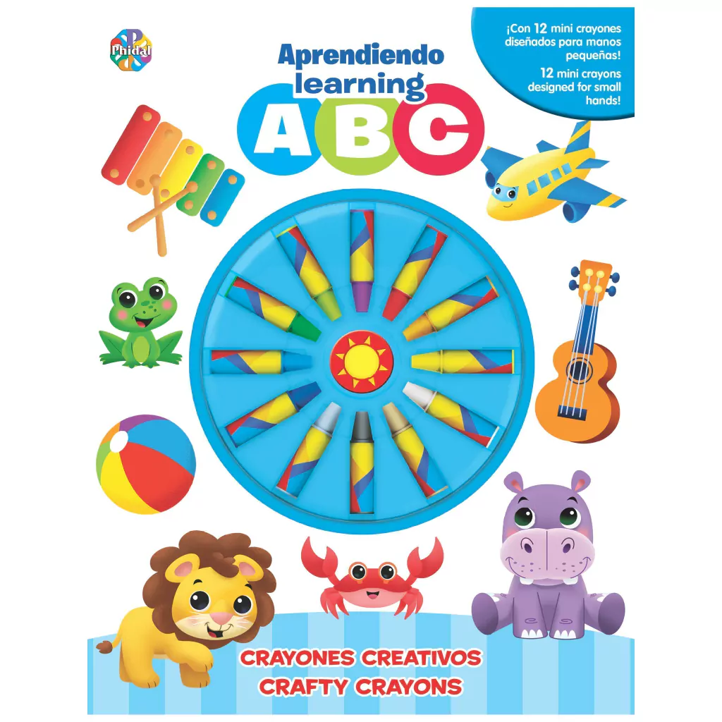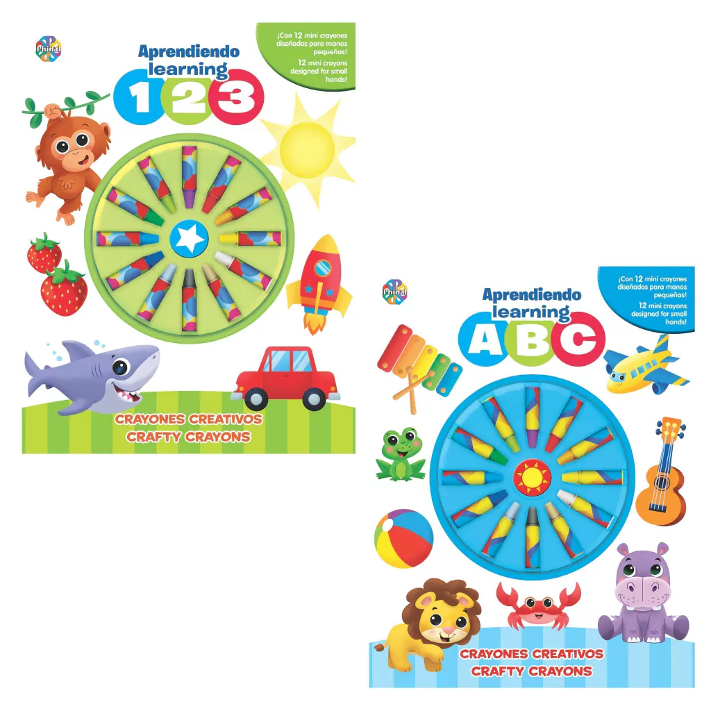 Una colección con hermosas ilustraciones y 12 mini crayones para colorear y aprender el ABC y el 123 en inglés y en castellano.