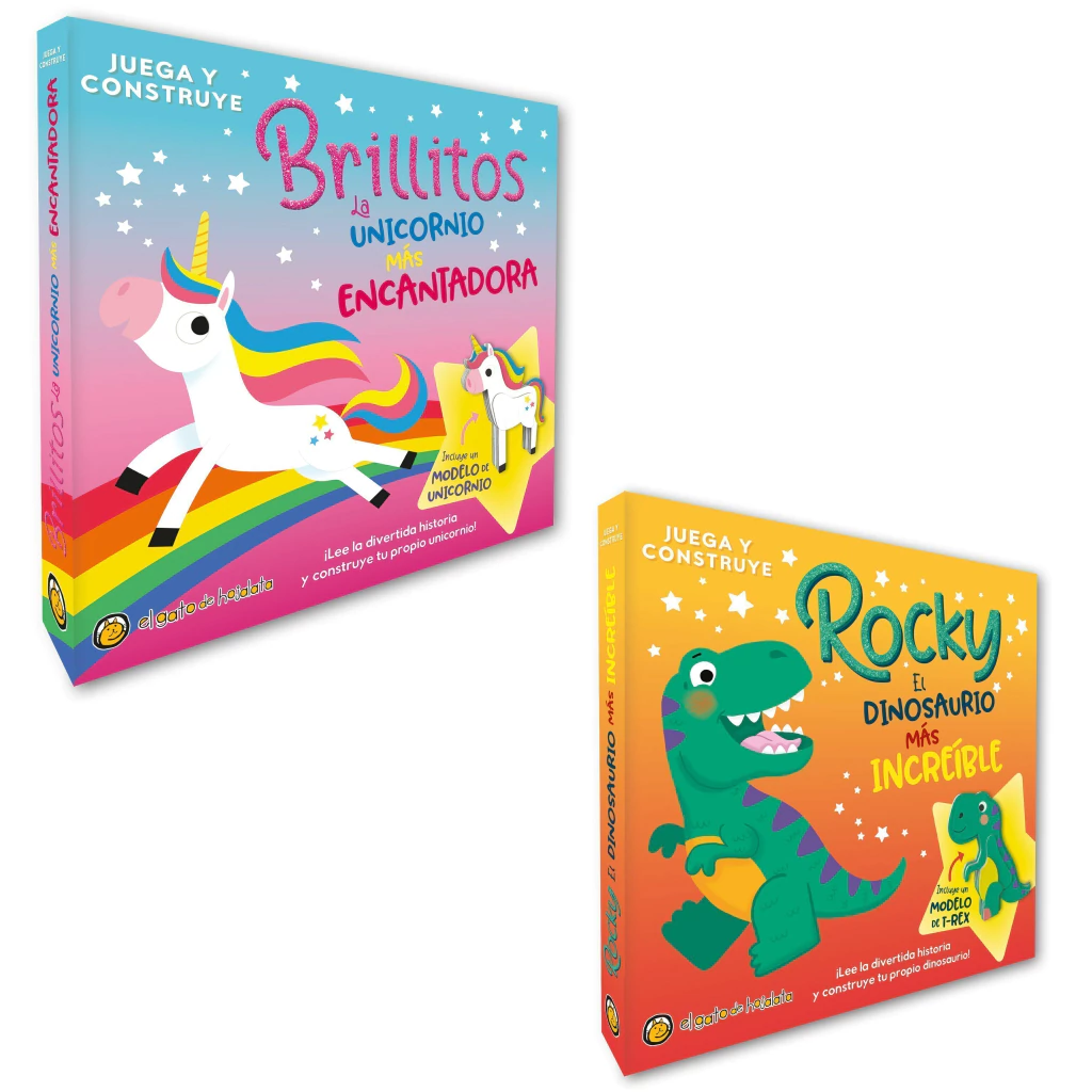 Dos kits increíbles que incluyen un libro con una historia divertida con rima y un paso a paso al final para armar tu dino o unicornio junto con las piezas correspondientes.