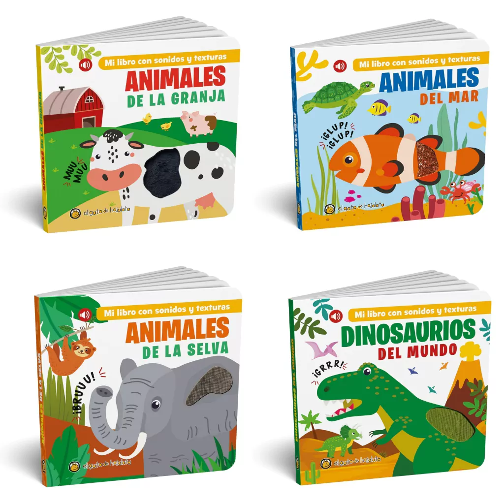 Increíbles libros con sonido y ¡texturas! En cada página podrán encontrar una textura que al tocarla activará el sensor de sonido. Será una experiencia inolvidable, además de interactiva, ideal para el aprendizaje de los niños. Incluye datos educativos de cada animal y cada dinosaurio.